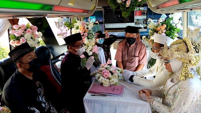 TRIBUNPANTURA.COM, KAJEN - Agar tidak menimbulkan kerumunan saat penerapan PPKM level 4, warga Kabupaten Pekalongan, Jawa Tengah, memilih melaksanakan akad nikah di dalam bus pariwisata yang sedang berjalan.
