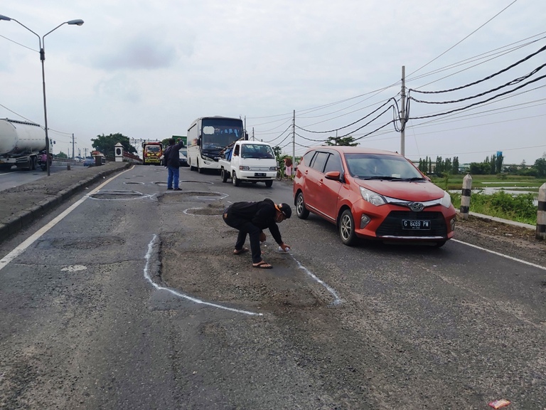 Jalan Rusak dan Berlubang di Pantura Pekalongan, Warga Tandai Pakai Cat Semprot