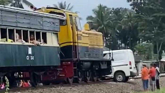 Sebuah mobil Gran Max warna putih tertabrak KA (KA) Wisata yang sedang melintas. Ini kronologinya.
