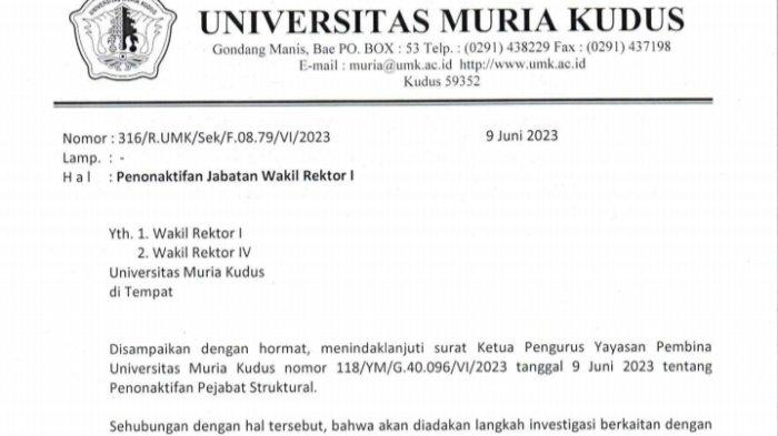 Universitas Muria Kudus mengeluarkan surat edaran terkait penonaktifan Wakil Rektor 1 Universitas Muria